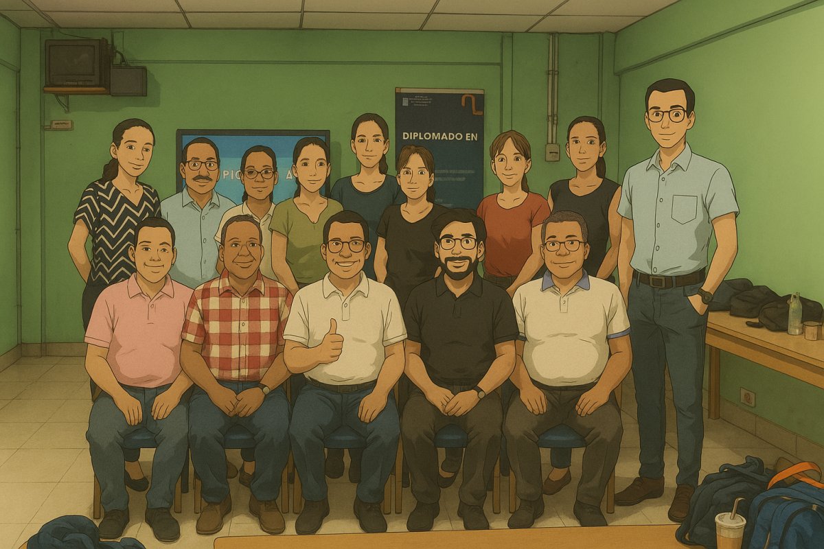 Contrastando Realidad versus Adaptación con IA en el boom de las fotos hechas en el estilo de Estudio Ghibli. Foto grupal con el equipo de trabajo bajo el liderazgo de nuestro profesor Yamid en el diplomado de Innovación Educativa.